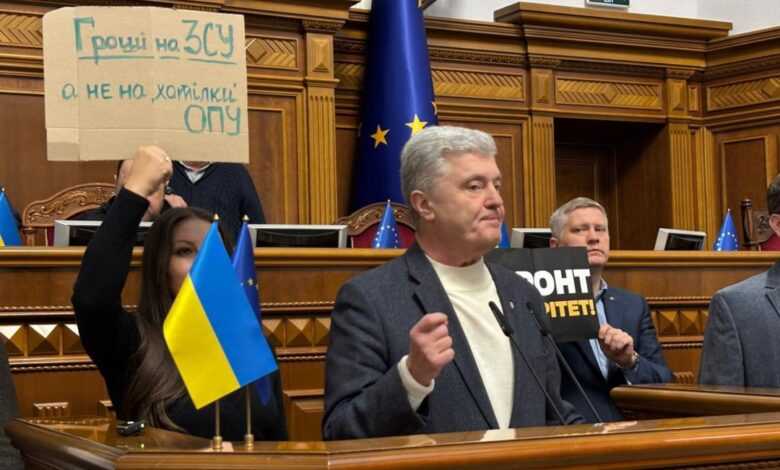 После выступления Порошенко представители фракции начали скандировать у трибуны лозунг «правительство в отставку».